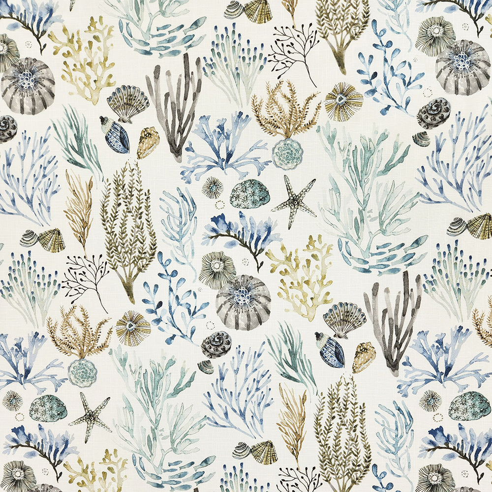 Soft beige cotton forms the backdrop for the playful 'On The Coast Seamist' design. Starfish, seaweed, shells, jellyfish, and minnows make up this unique, whimsical pattern that is sure to liven up your décor. Perfect for a beach house or an ocean-inspired space.